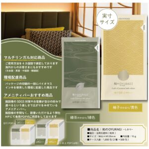 2026.02.12 和のOYUARGI-しおり- 15g 2種アソート 🍵和の雰囲気を大切にしたパッケージデザインで、 客室やアメニティバーにも自然に馴染む入浴アメニティです。 日本らしさを感じていただけるため、 海外のお客様にもおすすめです。 【入数:1000(2種×500包)】 一覧へ戻る