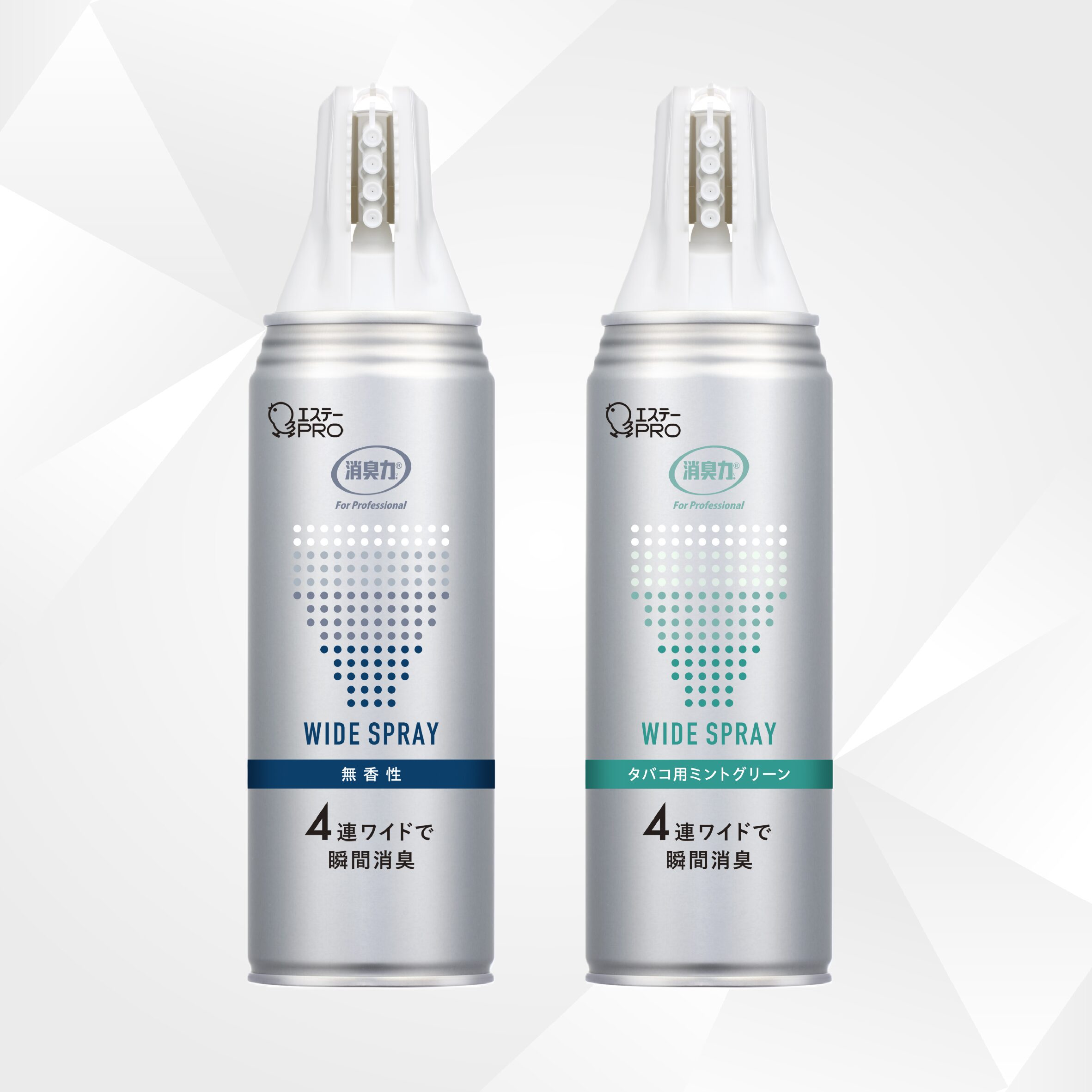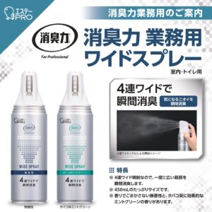 「消臭力 業務用 ワイドスプレー」は、トイレ個室や更衣室、喫煙室、ごみ収集場などの気になるニオイを瞬時に消臭できる業務用スプレーです。