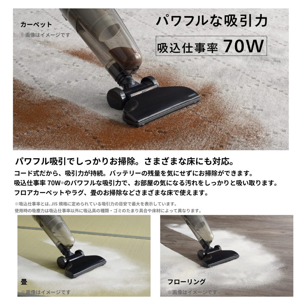 吸引力が安定しており、フローリング、カーペット、ラグ、畳などさまざまな床材の清掃に対応します。