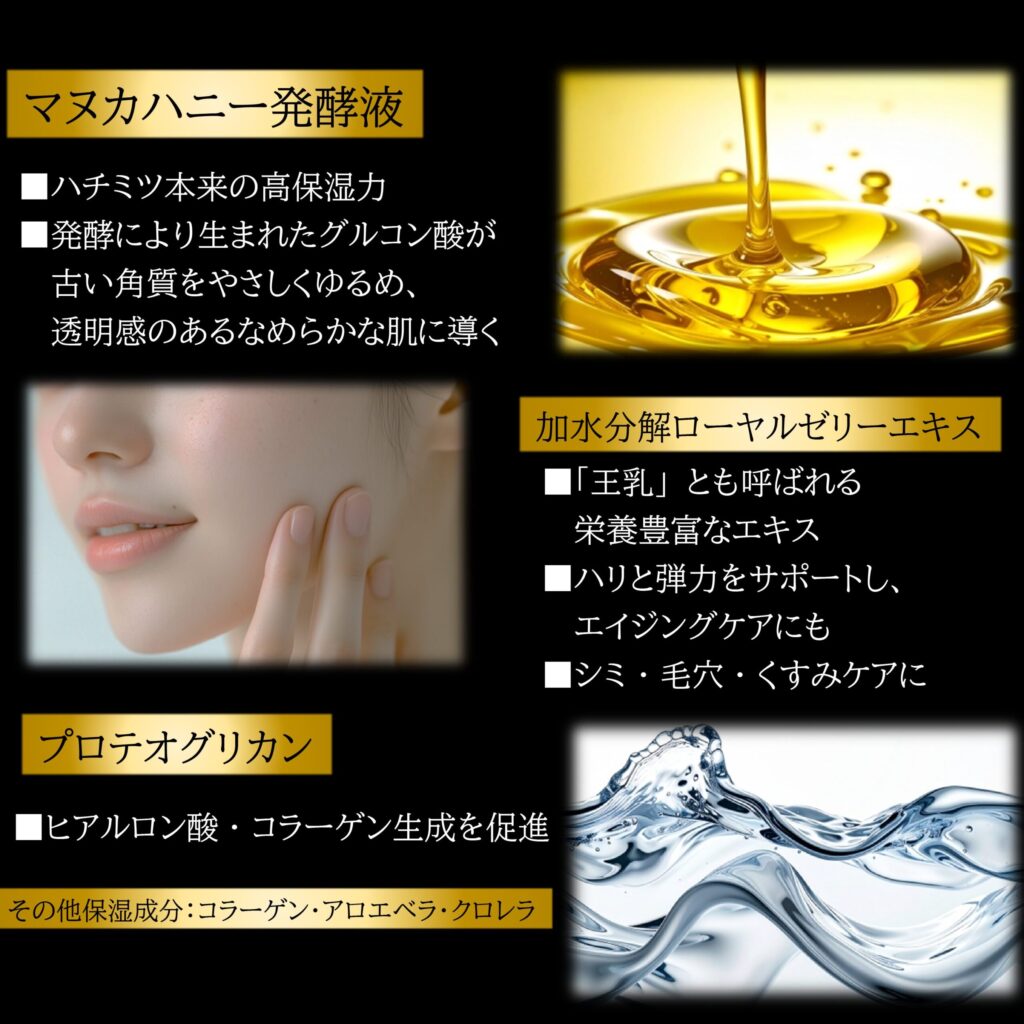 ハチミツ本来の保湿作用に加え、発酵の力で生まれたグルコン酸が古い角質をやさしくゆるめ、透明感のあるなめらかな肌へ整えます。