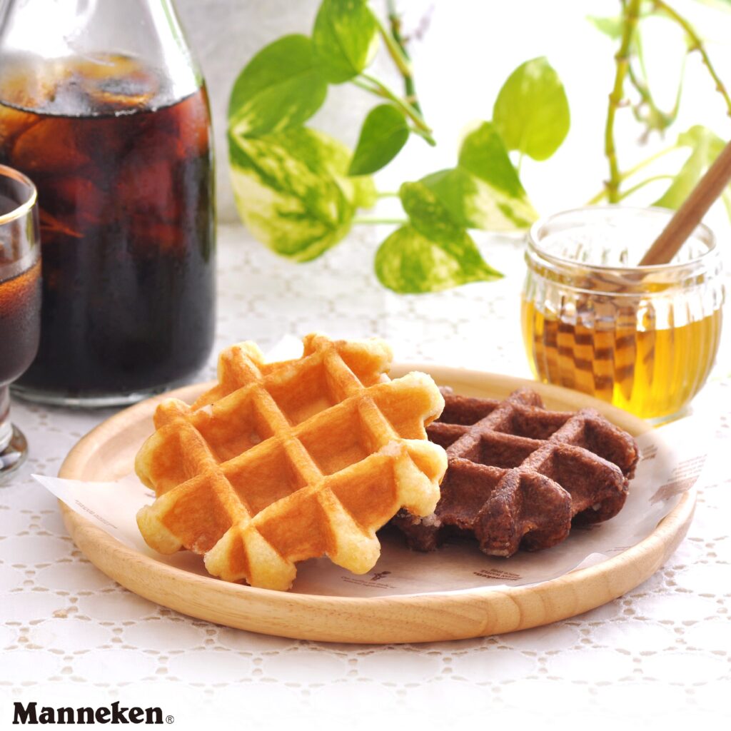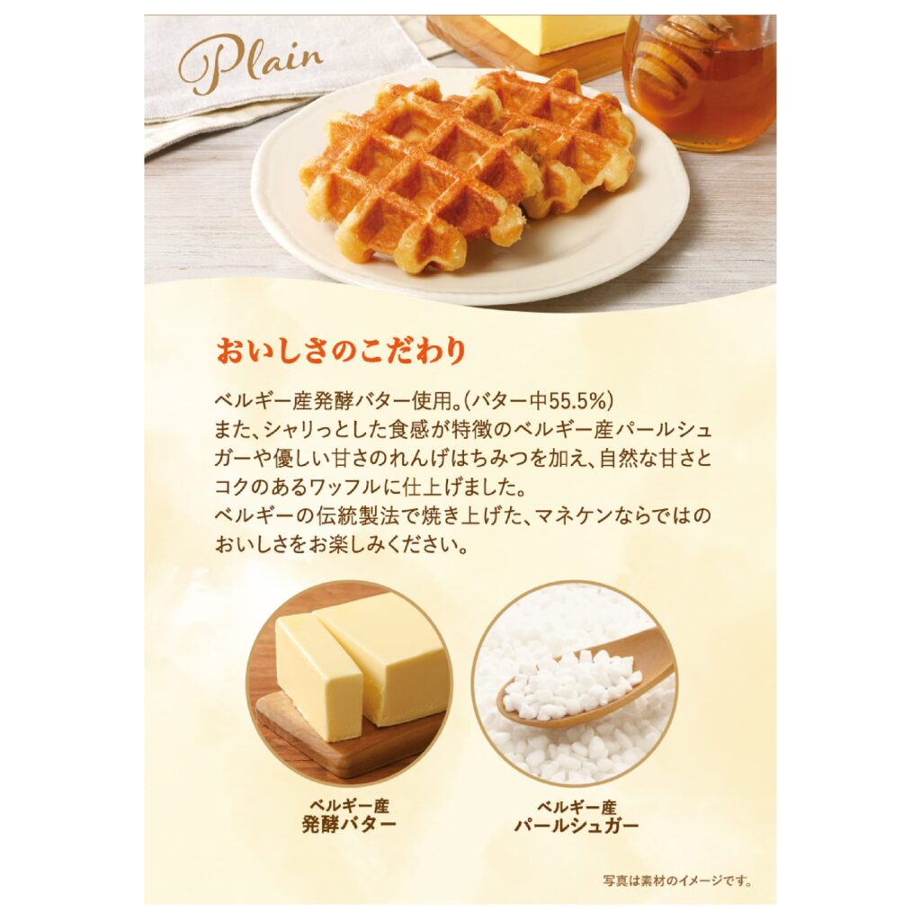 マネケン のベルギーワッフルは、発酵バターの豊かな風味と、外はさっくり中はしっとりとした食感が特長のロングセラー商品です。