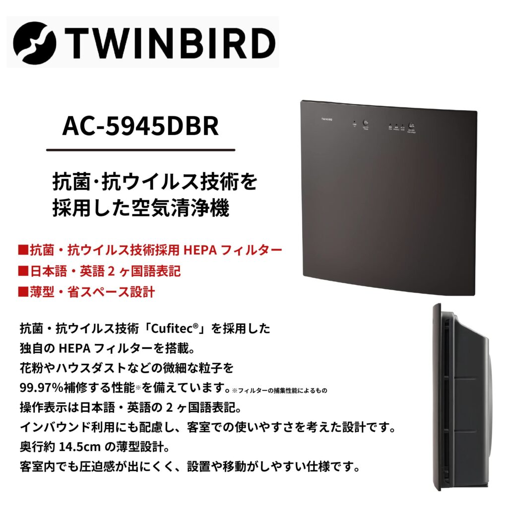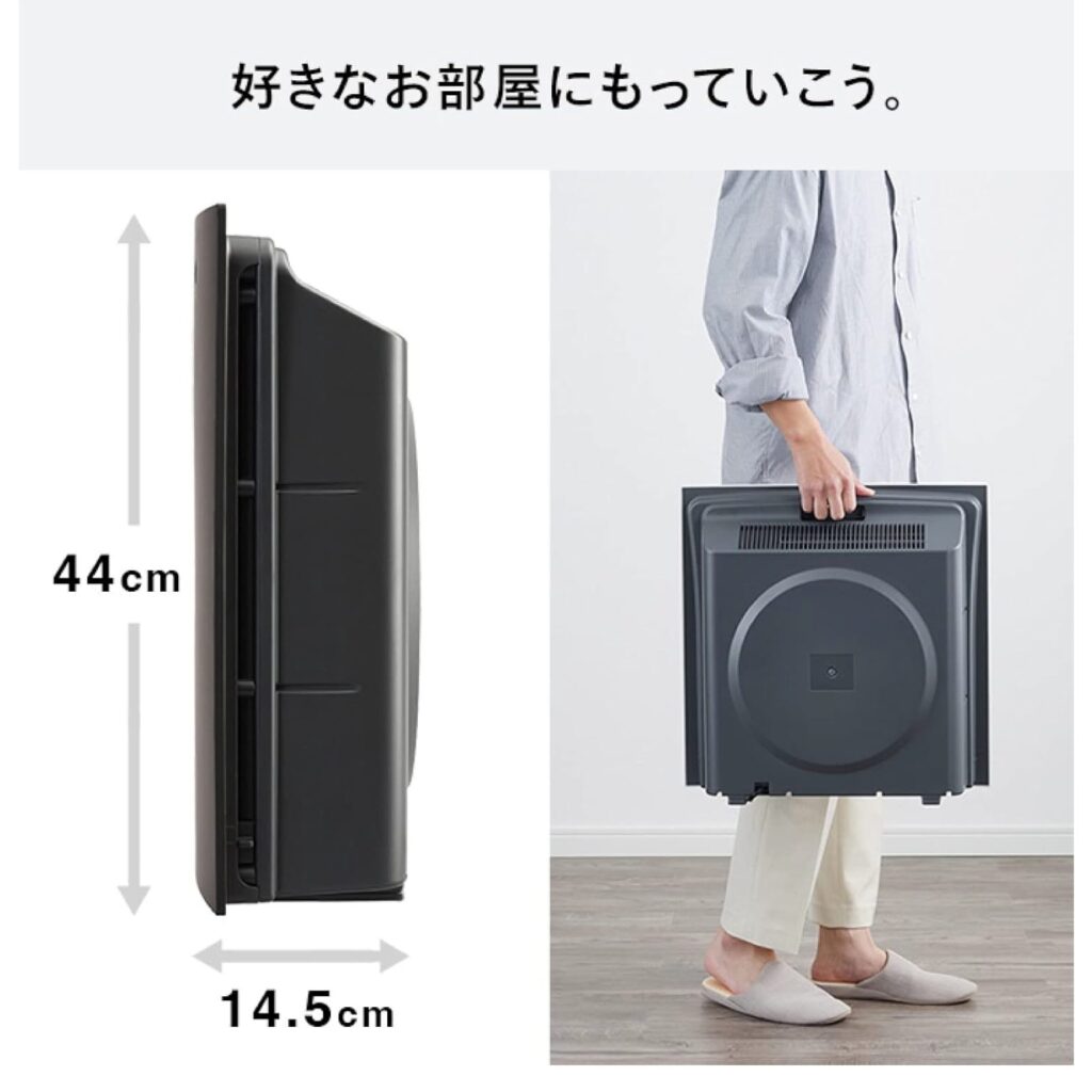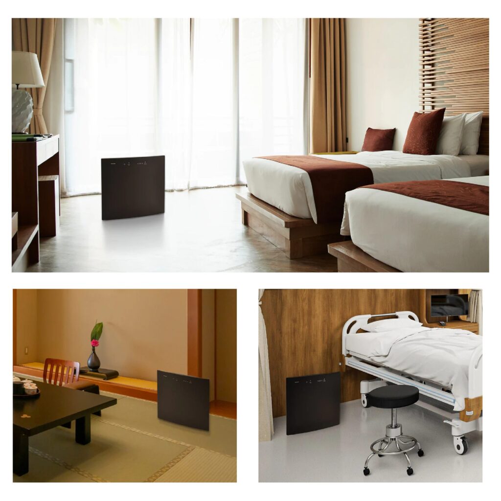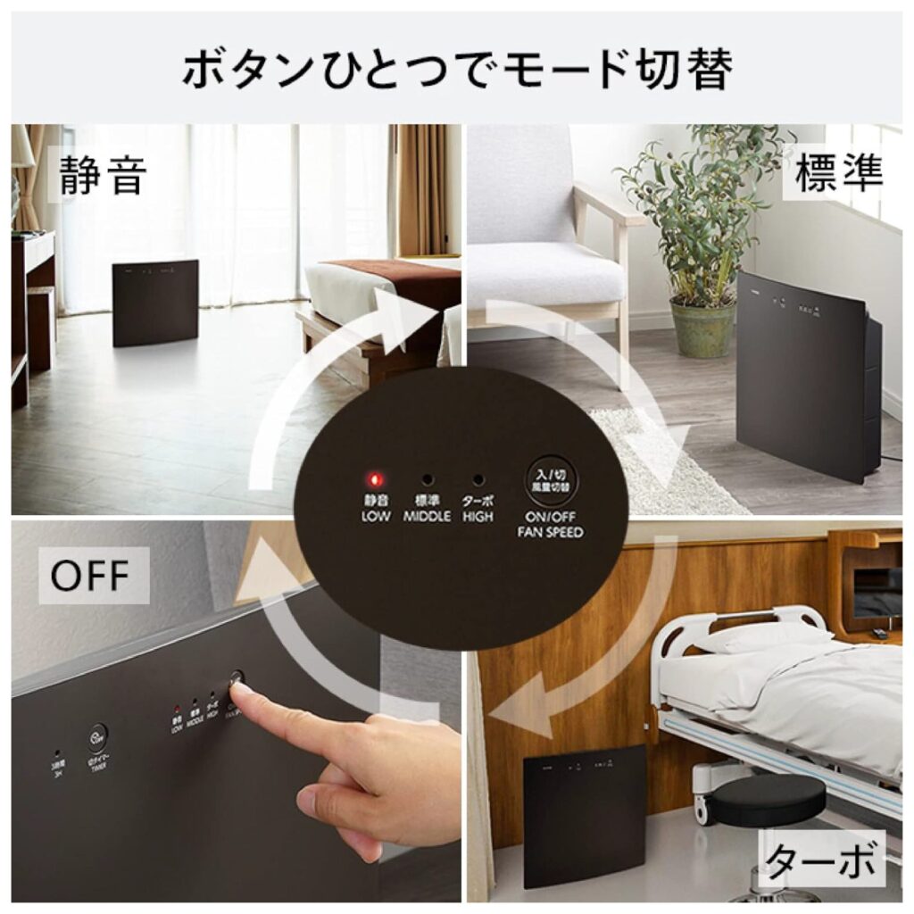 奥行約14.5cmの薄型設計で、客室内に設置しても圧迫感が出にくい空気清浄機です。