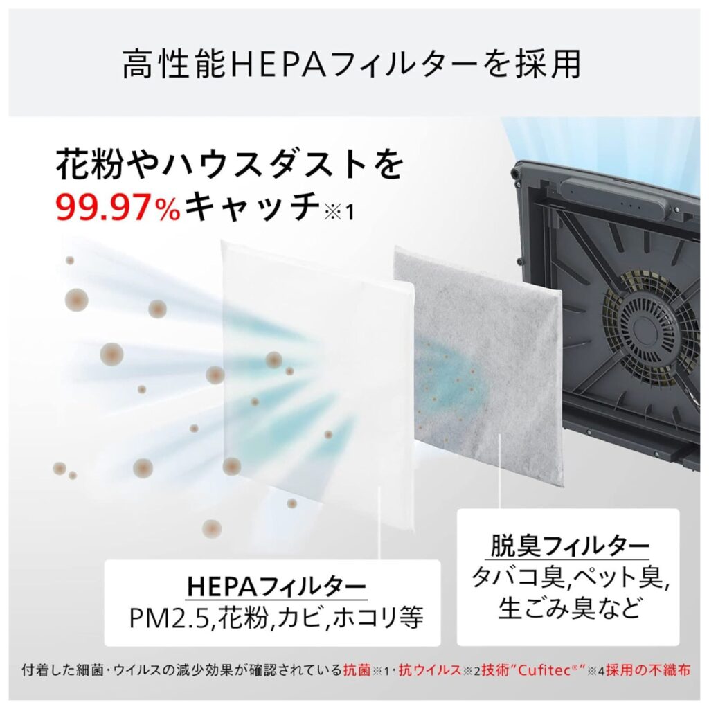 HEPAプリーツフィルターは、花粉やハウスダストなど0.3µmの微細な粒子を99.97%補修※
