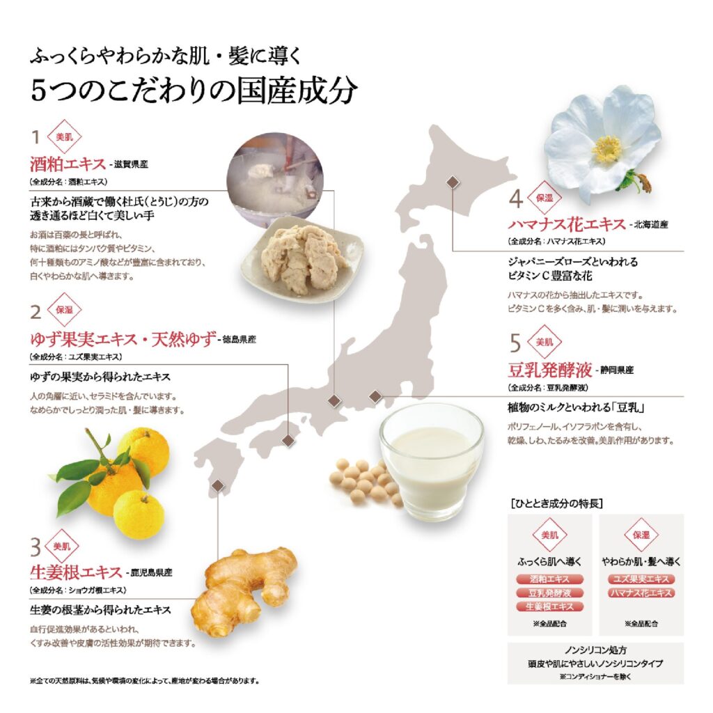 1.ふっくらやわらかな肌・髪に導く5つの国産成分